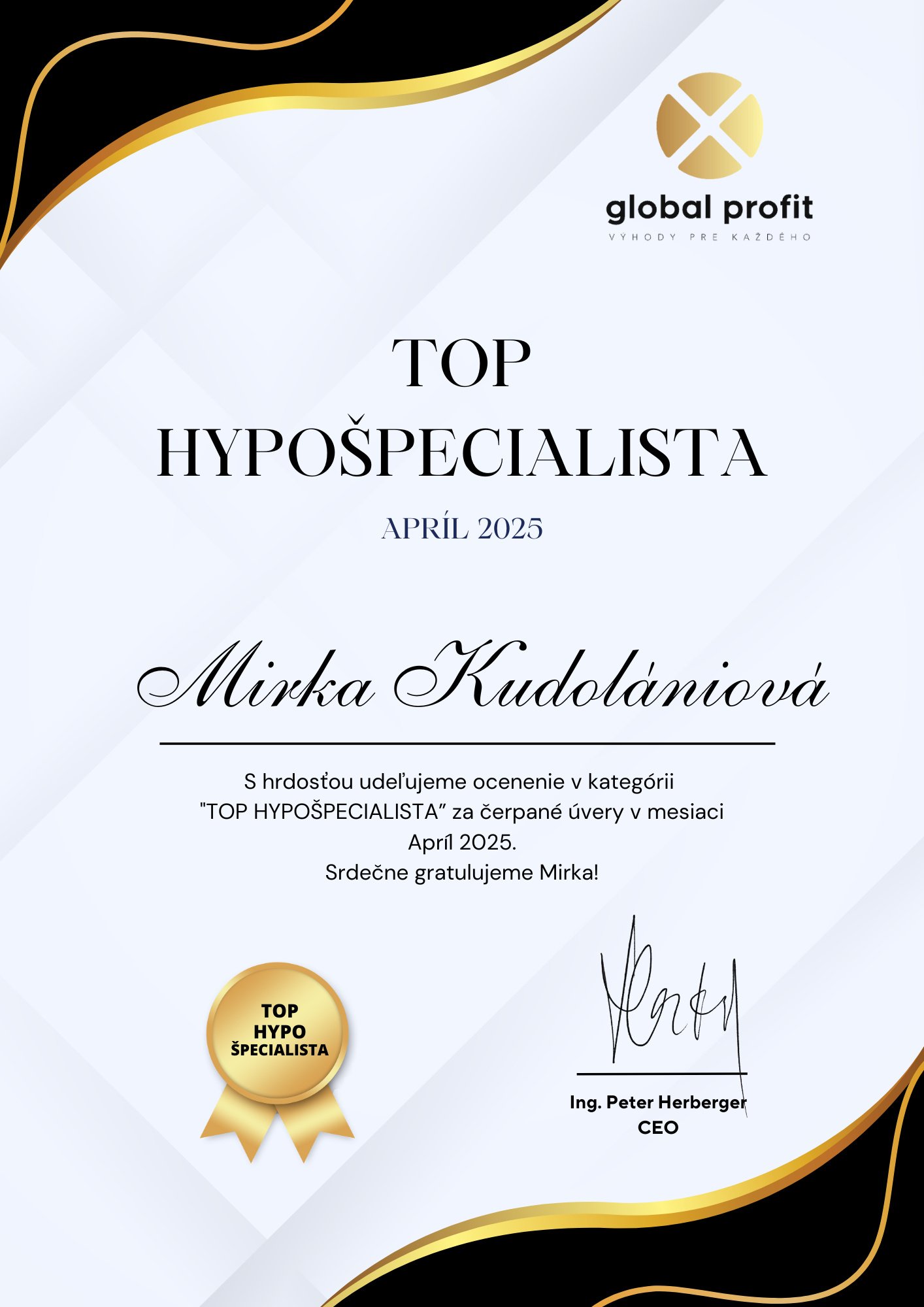 Chcem sa srdečne poďakovať pani Miroslave Kudolániovej za výnimočnú pomoc pri vybavovaní mojej hypotéky. Celý proces mi detailne vysvetlila a vždy bola ochotná odpovedať na moje otázky a hľadala pre mňa to najlepšie riešenie.